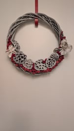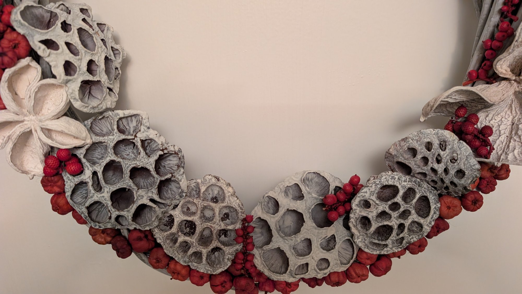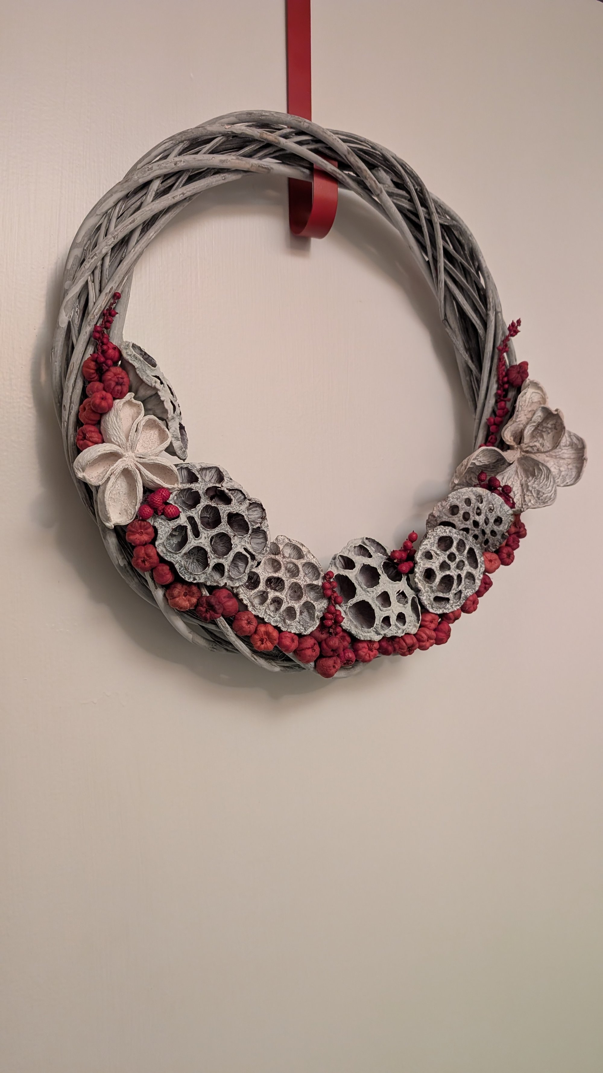 Large Willow Wreath, white washed with lotus pods and red berries and seed pods. very much 1 of a kind