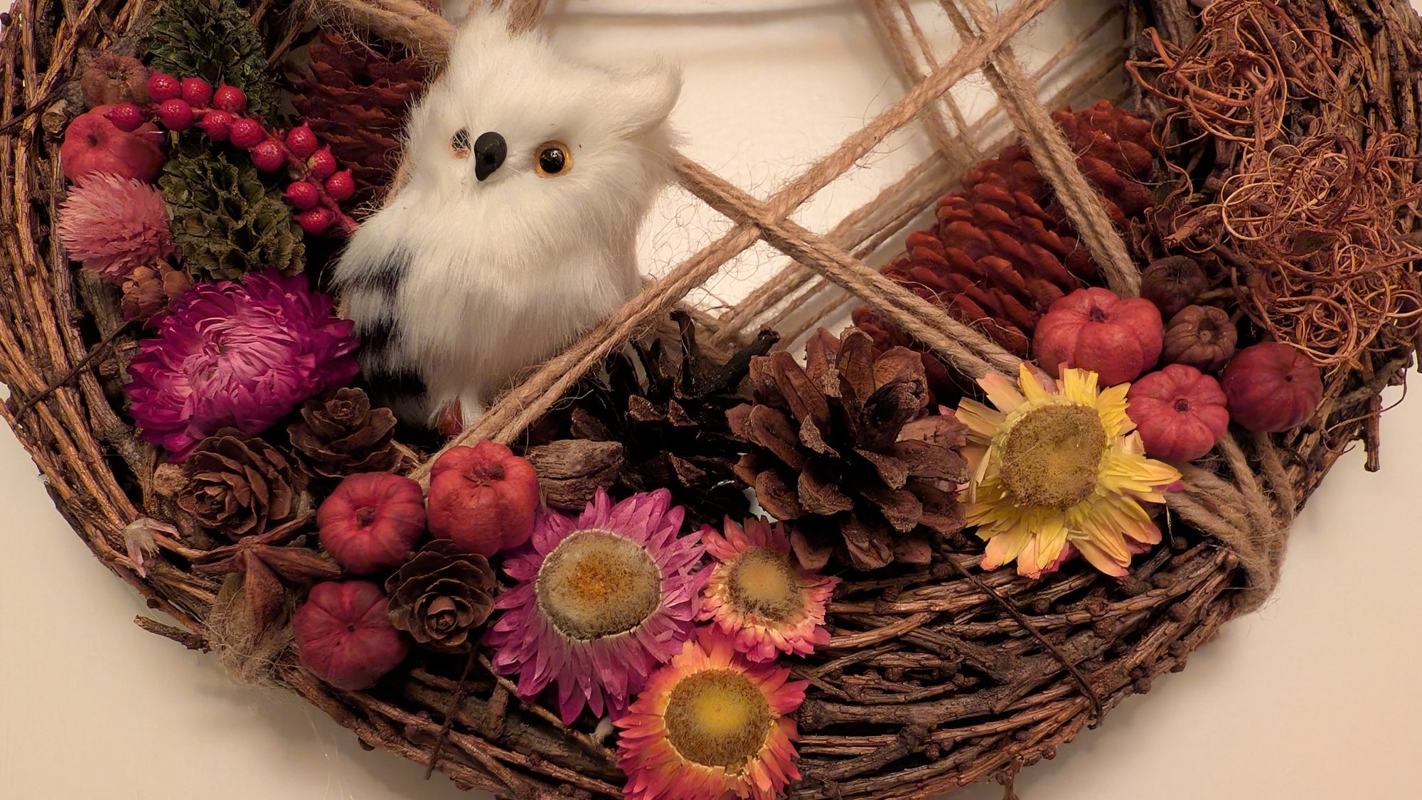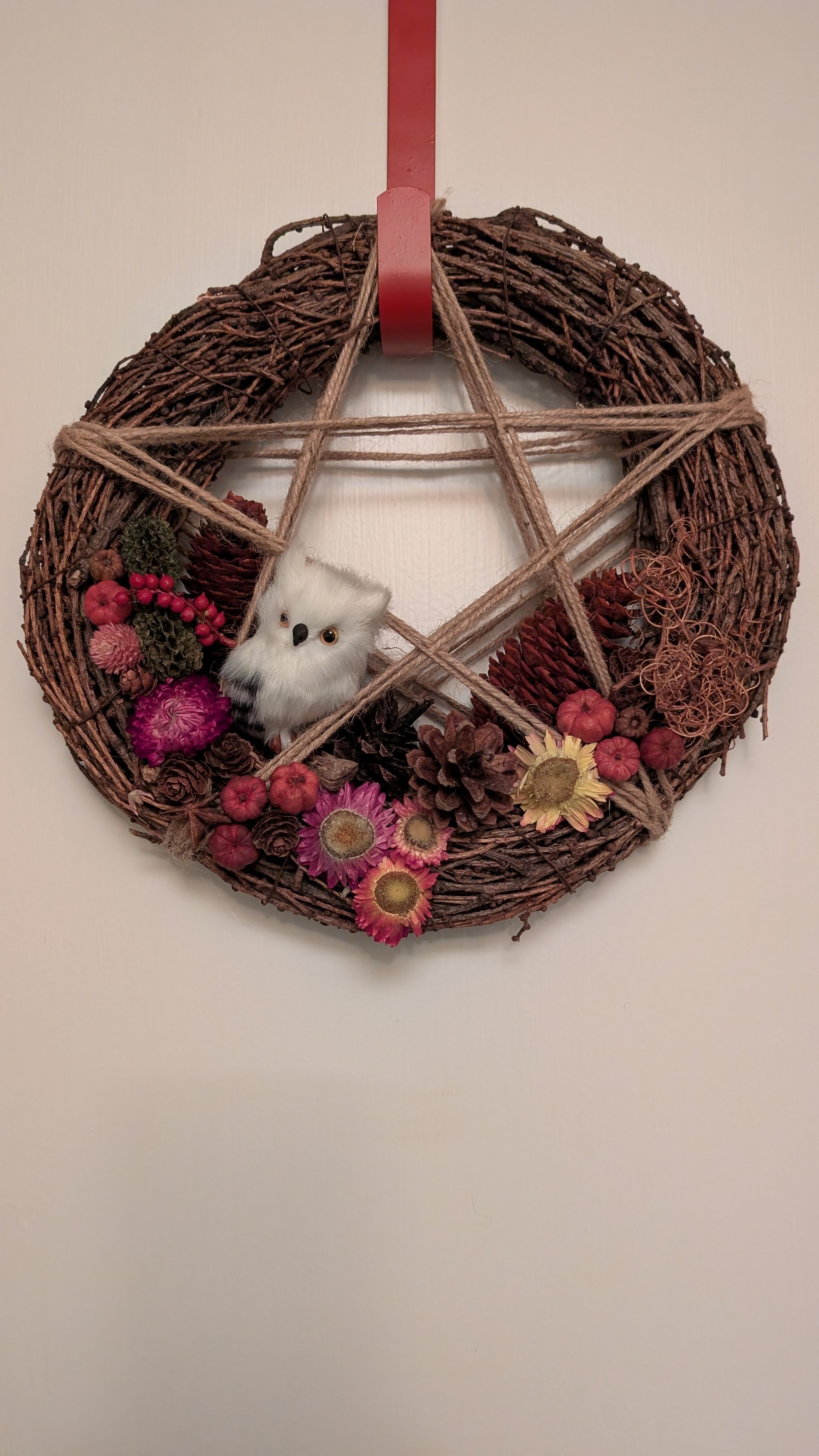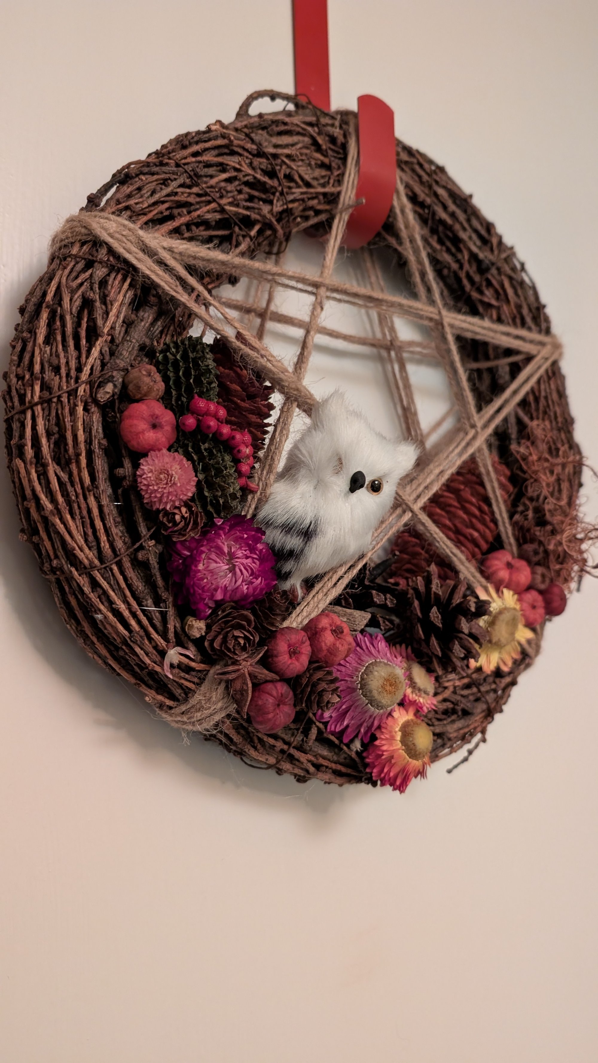 natural wreath with woodland cones, dried flowers and a plush small owl nestled within a 5 point star.